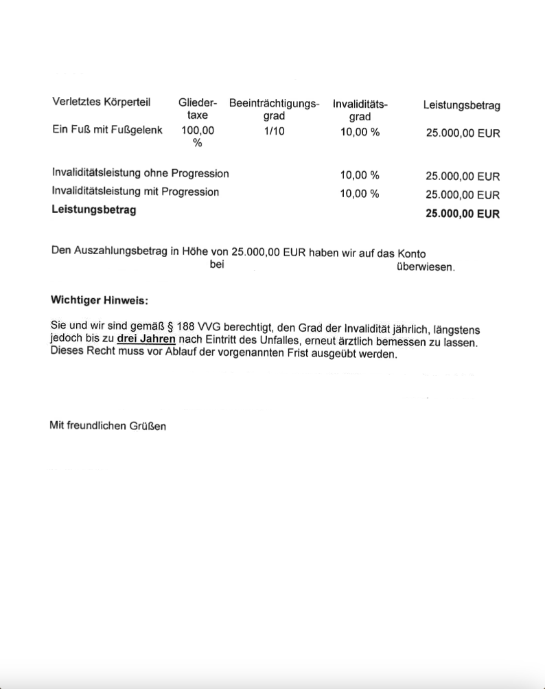 👉 Eines von vielen Leistungsbeispielen aus unserer Praxis: ein Bänderriss im Sprunggelenk mit einer Leistungsabrechnung von 25.000,- EUR! Der mtl. Beitrag lag konkret bei 27,50 EUR, die IV-Grundsumme bei 250.000,- EUR. (die tatsächliche Leistung hängt immer vom individuellen Tarif und dem Gutachten ab!)